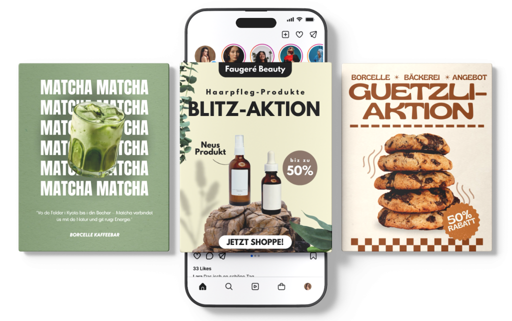 Jeder Pixel zählt. Unser Creativeteam gestaltet visuelle Konzepte, die im Feed auffallen, deine Marke stärken und messbare Resultate bringen, auf Meta und Google. Wir verbinden Daten mit Design, um aus Kreativität Wachstum zu machen.